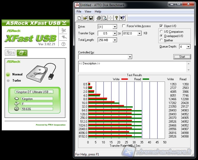 Esaminiamo insieme il Bandwith della Asrock X79 Extreme4 lato connettività sia USB 2.0 che 3.0. Verranno utilizzati ATTO e CrystalDiskMark per misurare i valori di Transfer-Rate connettendo il Pen Drive che abbiamo usato come campione, un Kingston DT Ultimate 64GB, sia ad una porta USB 3.0 che sulla più lenta USB 2.0.