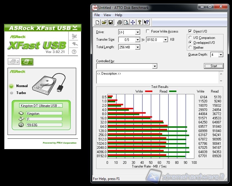 Grazie allo standard USB 3.0 ed alla sua velocità più elevata le differenze in termini di Transfer-Rate sono palesi sia utilizzando ATTO che CrystalDiskMark. Oltretutto il vantaggio derivante dall’uso del tool ASRock XFast USB è palese sia utilizzando una connessione USB2.0 che USB3.0.